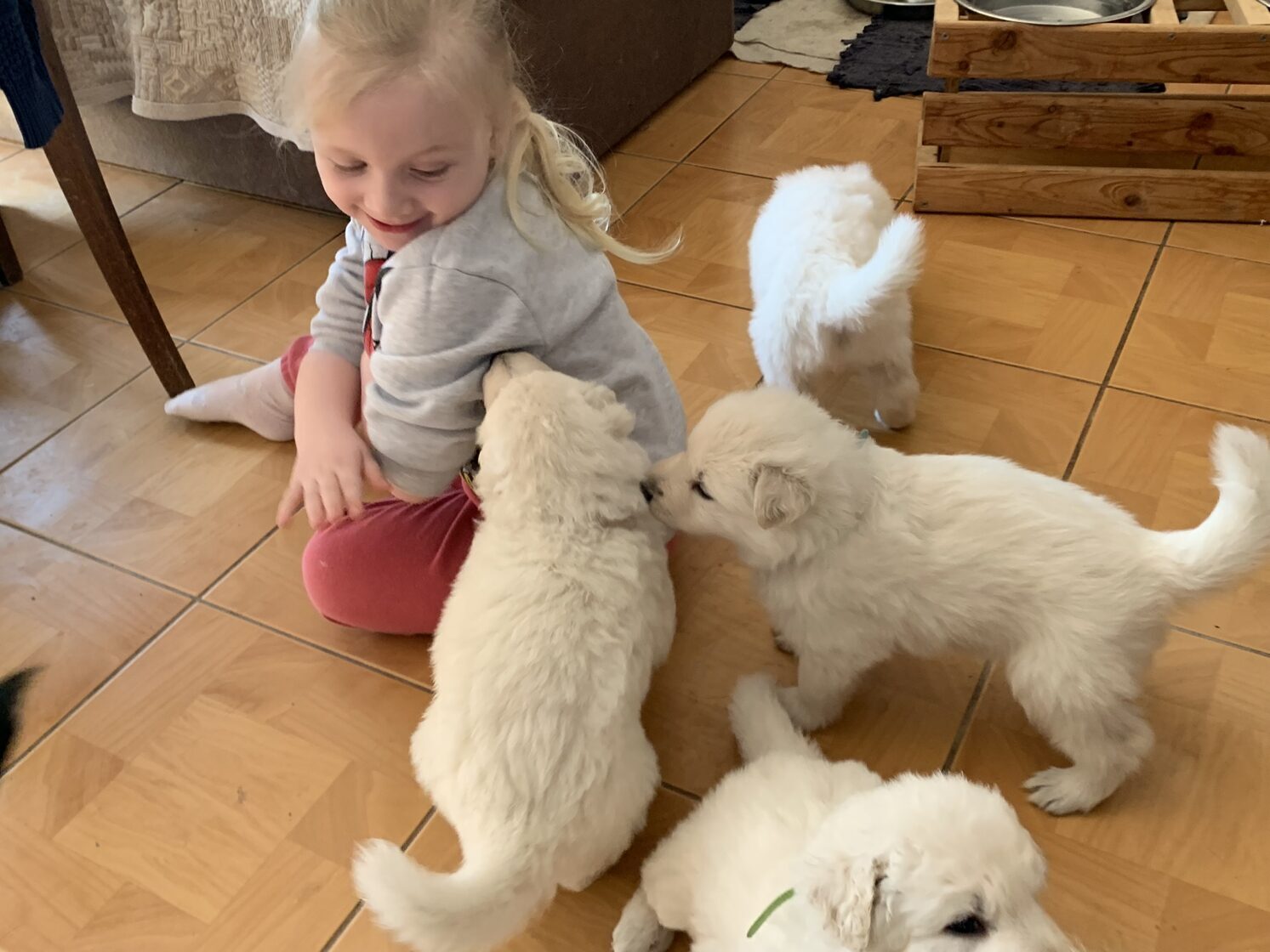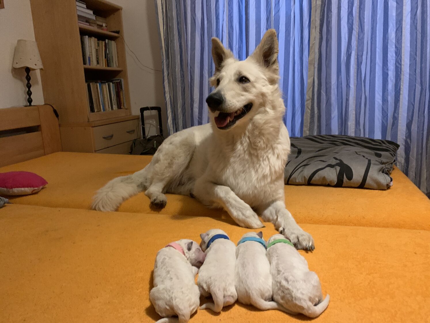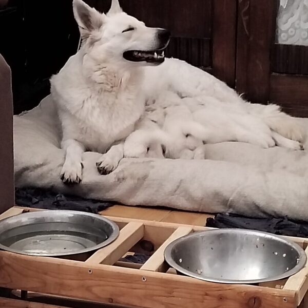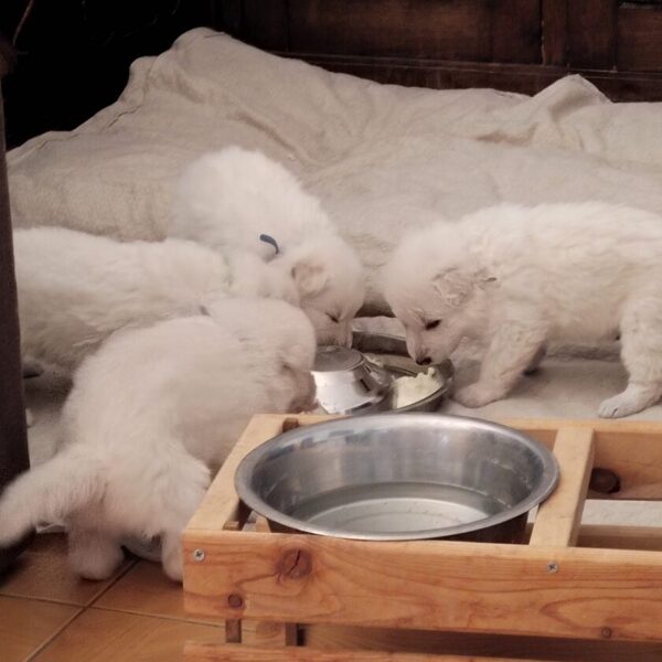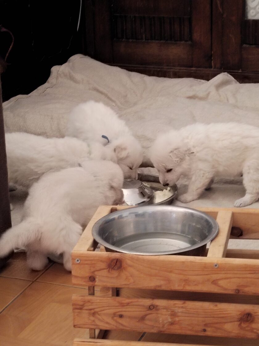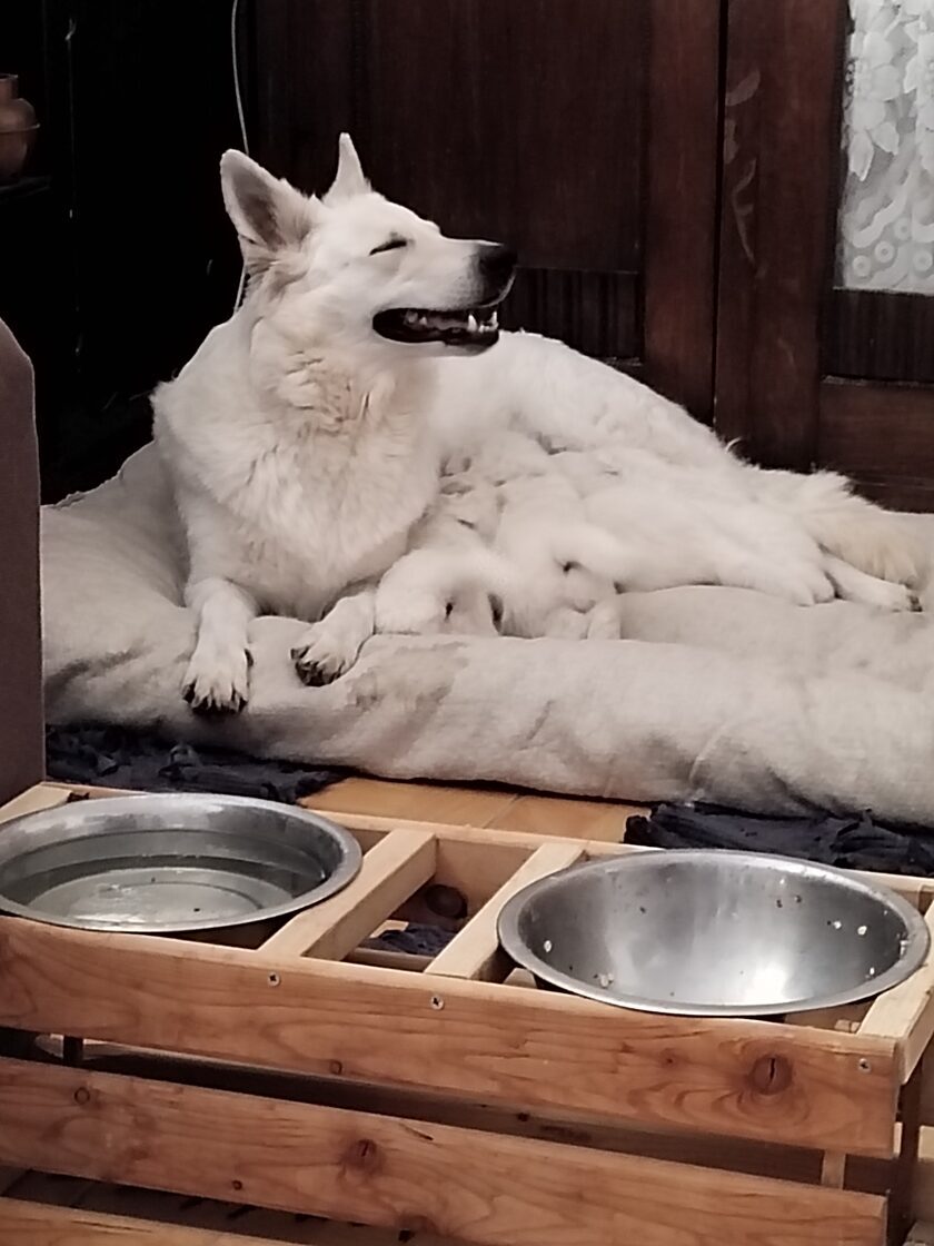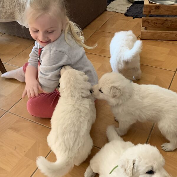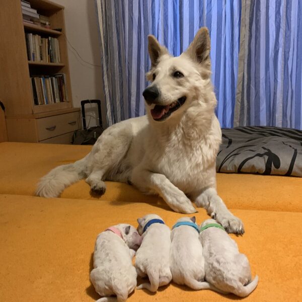 Krásný a úspěšný první vrh naší chovné stanice. Vrh odrodila naše fena Wabi Taien v zimě roku 2023. Matka Wabi Taien, byla temperamentní, vyrovnané povahy. Její výsledky rentgenů kyčlí a loktů byly také výborné (DKK 0/0, DLK 0/0). Velmi dobře vycházela se všemi ostatními členy jak zvířecí, tak i lidské rodiny. Otcem je ECCO Bílá Merci, je to nádherný dlouhosrstý pes s mnoha tituly, povahově klidný, vyrovnaný a s výbornou genetickou výbavou (DKK 0/0, DLK 0/0). Věříme, že tyto vlastnosti předal i našim štěňátkům. Štěňátka se narodila 4: Alli, Amina, Arian a Andry.